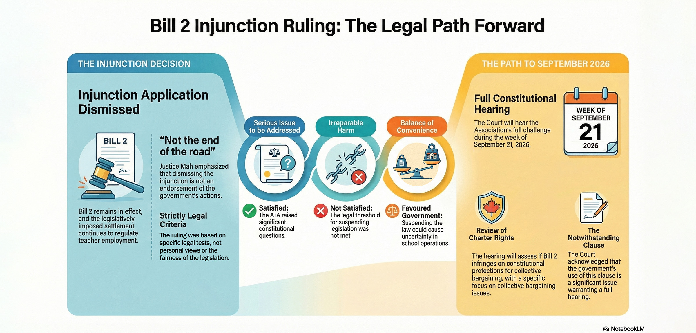 In making his ruling, Justice Mah was careful to emphasize that his decision should not be interpreted as an endorsement of the government’s actions or of the legislation itself. Rather, he said that his role was not to assess whether Bill 2 is fair or good public policy, but to apply the legal test used in Canada to determine whether legislation should be suspended while the case against it proceeds. The graphic below illustrates the three-part test an injunction must meet to be granted.