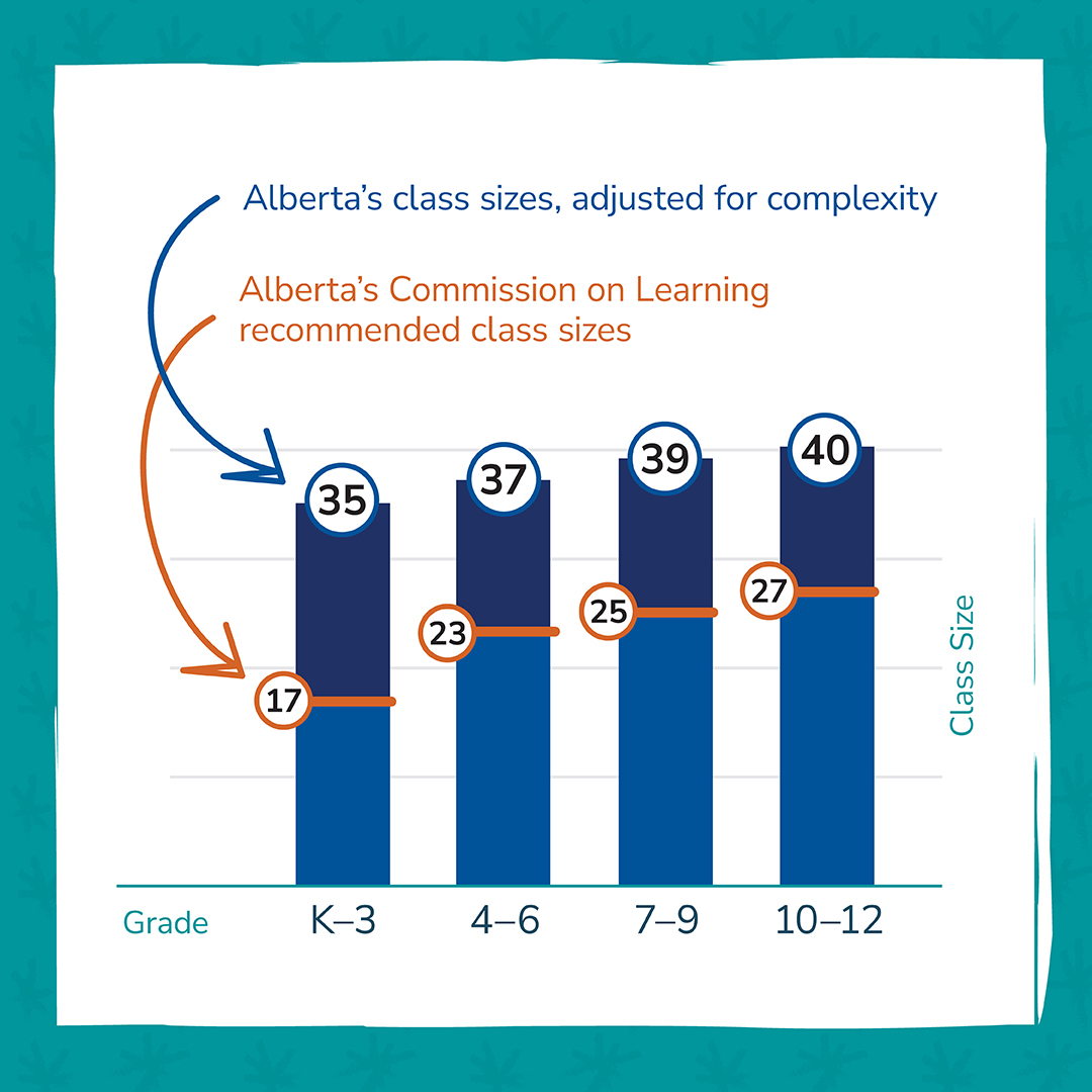 Based on class size and complexity data gathered through the survey, the average indexed class size in Alberta was 38. That is, when various complexities are factored in, the average teacher workload is the equivalent of 38 typical students.