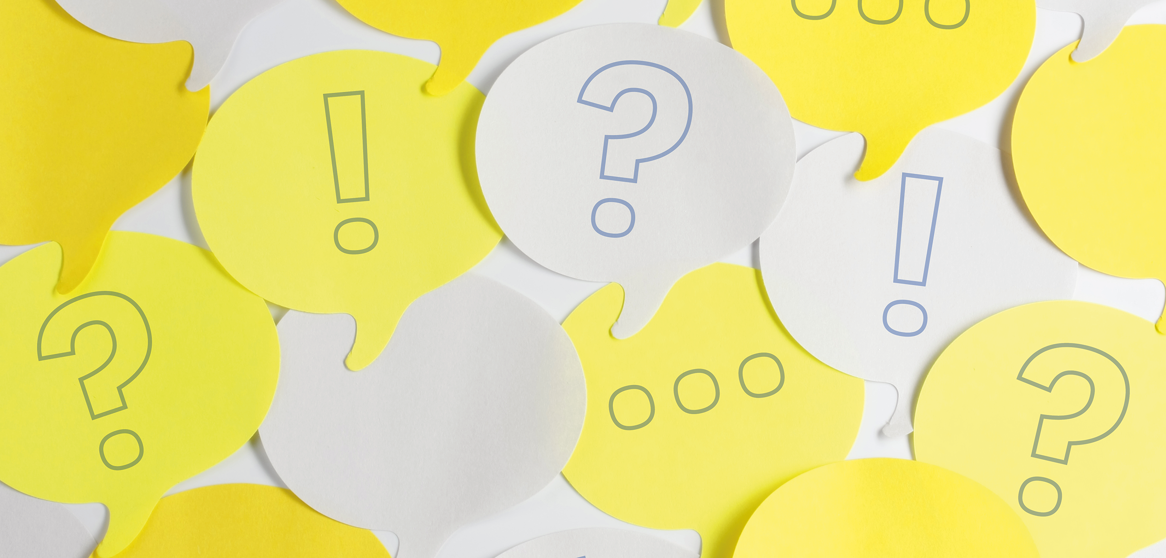 Image White and yellow speech bubble post-it notes with hand drawn ellipses, question and exclamation marks, Image February 23, 2023 View View